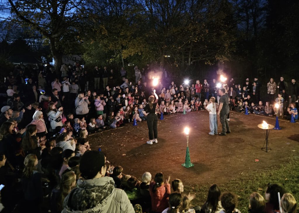 Der Schulhof wurde nicht nur durch zahlreiche, kunterbunte Windlichter erhellt, die die Kinder im Vorfeld gestaltet hatten. Auf einem festlich geschmückten Schulhof verbrachten viele Familien bei Brezeln, Kinderpunsch und beim Singen von Herbst- und Martinsliedern einen geselligen Nachmittag. Außerdem konnte eine Feuershow bewundert werden und jede und jeder konnte an einer großen Tombola teilnehmen, mitfiebern und – mit etwas Losglück – tolle Gewinne erhalten!