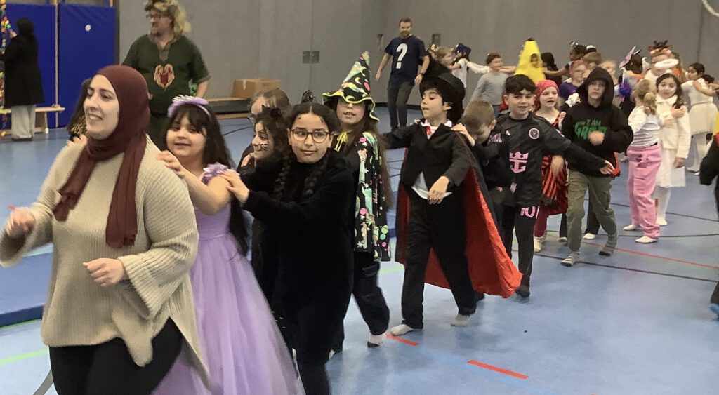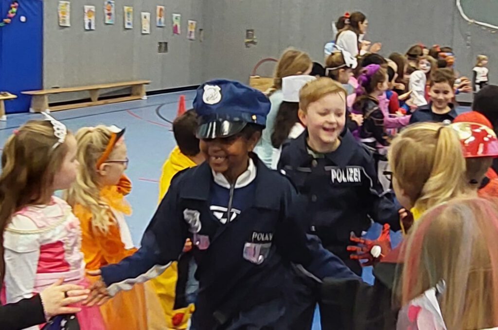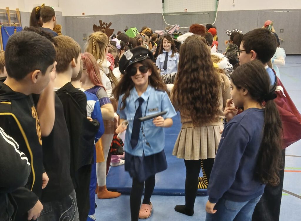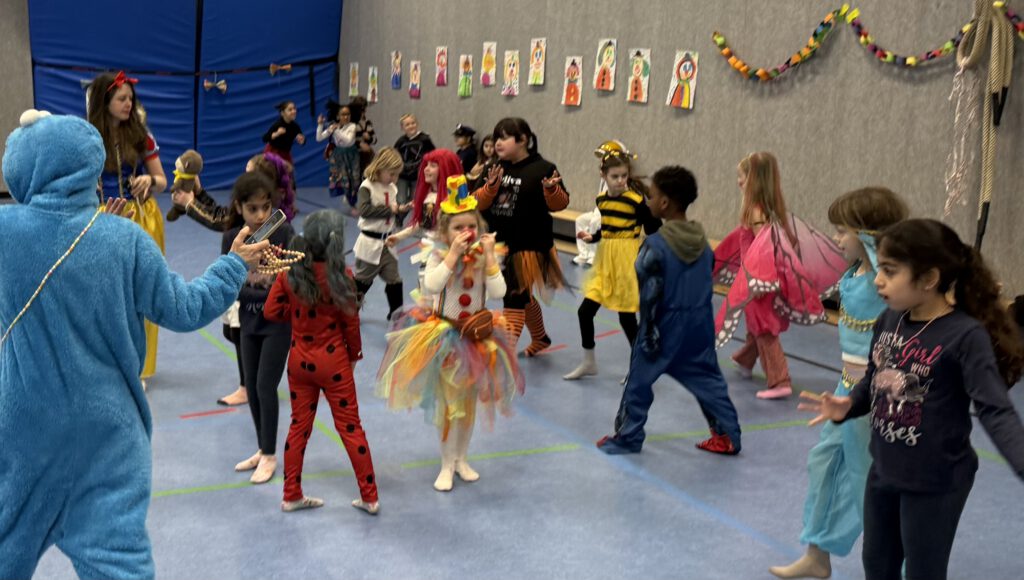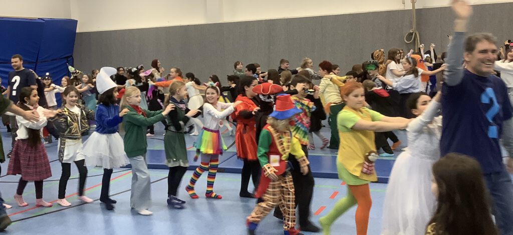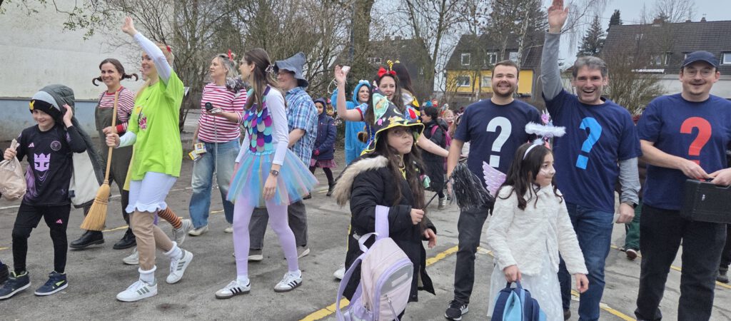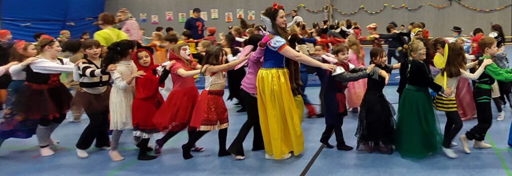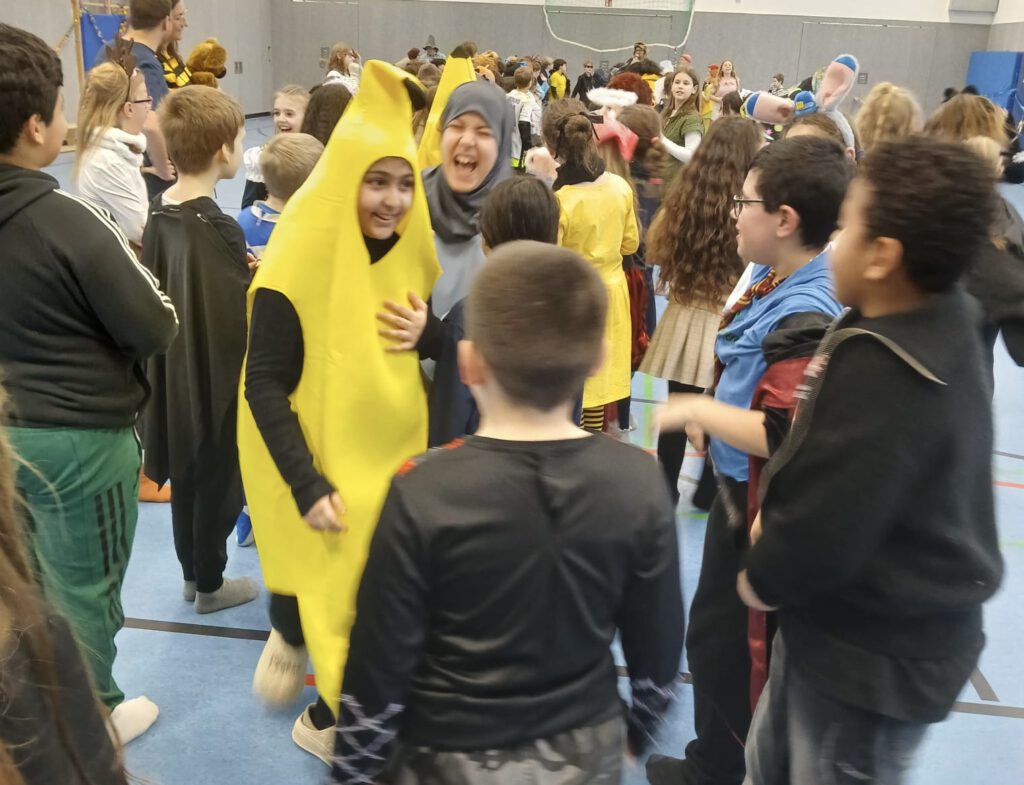 Auch die Kinder kamen bunt verkleidet und ausgelassen zur Schule – so wurden die Lehrer*innen um 8:15 Uhr bei der kleinen, traditionellen Begrüßungspolonaise über den Schulhof von Rittern, Meerjungfrauen, Superhelden, Schmetterlingen, Prinzessinnen und vielen anderen kreativ verkleideten Kindern begrüßt.