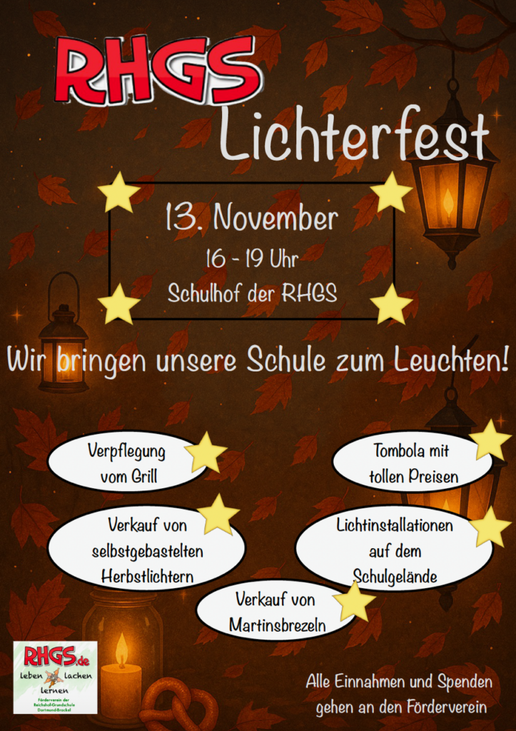 Am 13. November laden wir herzlich alle Schüler*innen und ihre Familien, zu unserem Lichterfest auf dem Schulhof der RHGS ein.